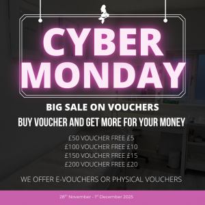 Buy a Madison Beauty gift voucher in our exclusive Cyber Monday promotion for £50 or more and get a bonus voucher completely free. More details below but hurry, this offer is only available from 28 November until 1 December 2025.